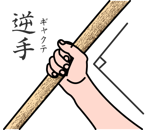 Dans la première forme de saisie GYAKUTE 逆手 , le sabre est simplement tenu dans la main tel un objet externe, qui ne fait pas partie de notre corps. Le pratiquant va saisir le sabre de manière perpendiculaire à son bras sans vraiment intégrer la notion de « faire un avec le sabre ».