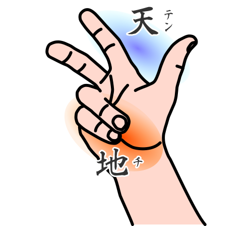 • le pouce, l’index et le majeur forment la partie TEN 天 (le ciel, le Paradis)