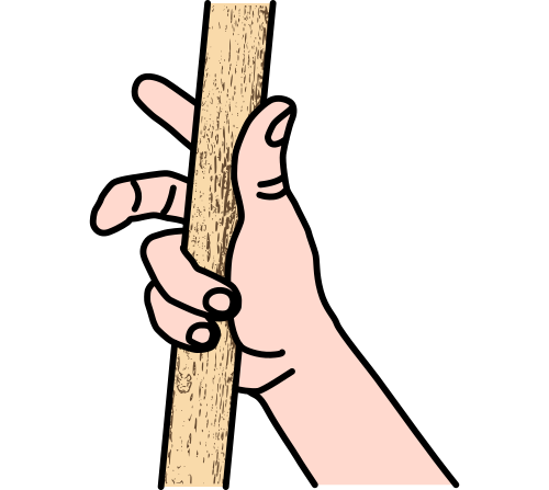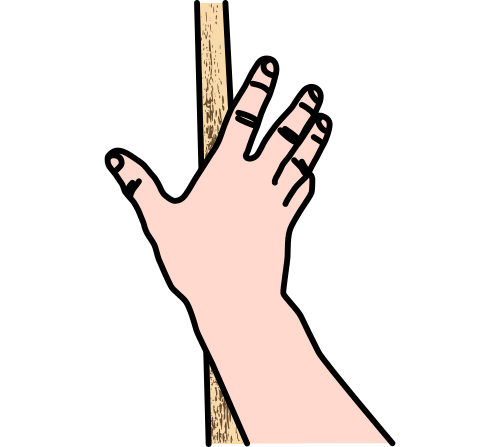 L’aboutissement du bras se situe vers la base de la paume. C’est à cet endroit que doit passer l’outil pour faire corps avec la main. Le petit doigt est le seul qui peut arriver à l’aplomb de ce secteur. Le deuxième doigt (l’auriculaire) arrive pas loin, et on s’éloigne de plus en plus au fur et à mesure.