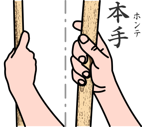 La seconde forme de saisie cherche à transformer l’instrument en une extension de notre propre corps en établissant un contact solide entre l’instrument, la main et donc – via le bras, l’épaule et le dos – les hanches et l’abdomen (SEIKA TANDEN 臍下丹田) qui sont connectés au sol. Elle est souvent nommée HONTE 本 手 mais peut avoir d’autres appellations.